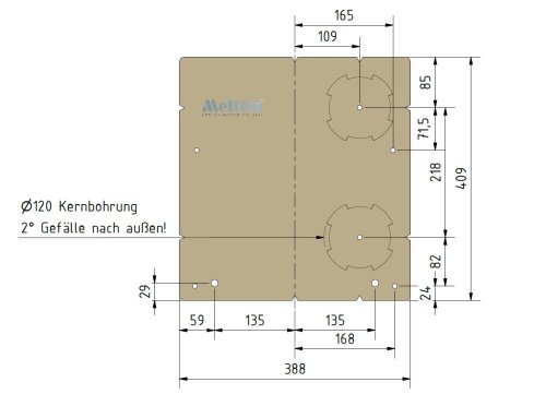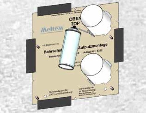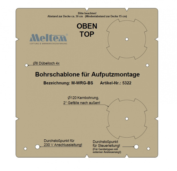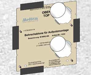 Doporučujeme vždy použít montážní a vrtací šablonu při instalaci větracích jednotek Meltem. Velmi důležité je použití šablony při fixaci potrubí PUR pěnou.